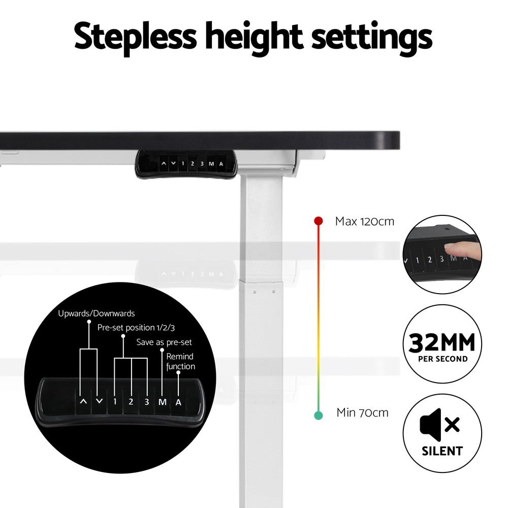 Poor posture and sedentary lifestyles contribute to several health issues. Now keep your health in good shape with the Artiss Motorised Adjustable Desk Frame! Designed to go with our Artiss Desktop, it wont disappoint you either with its quality or aesthetics. With our innovative height-adjustable desk frame, you can stand while working and stretch and engage your muscles to prevent them from weakening. Our desk frame features an easy-to-use digital control panel that enables you to easily adjust the desk to a suitable height and ensure your comfort while working. Save up to 3 pre-set heights so you can instantly get comfortable whenever you need. The smooth motors allow for ultra-quiet operation with low energy consumption. Our high-quality powder-coated desk frame makes cleaning and maintenance easy and ensures ultimate sturdiness. It also comes with adjustable rubber foot pads that offer extra stability and keep your floors safe. As for the desktop, it comes with pre-drilled holes for easy installation. It is made from eco-friendly particleboard and comes with a natural wood grain or contemporary matte finish to create a smooth surface and a beautiful aesthetic. The desktop is scratch resistant and perfect for all your working needs. Get yourself Artiss Motorised Adjustable Desk Frame and Desktop to prevent fatigue and improve productivity.