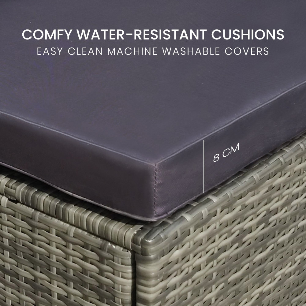 The set includes ultra-comfy 8cm thick water-resistant seat cushions, generous backrest cushioning and a premium throw cushion. The high-quality UV-resistant handwoven Suntech wicker in Marl Grey weave has a premium natural textured look. With a modular design comprising a sofa, one corner sofa and an ottoman, you can set it up in whatever configuration works best for you. This London Rattan outdoor lounge setting is a great addition to any outdoor space.