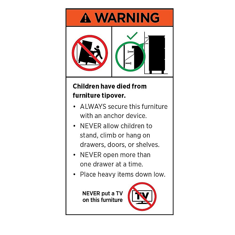 - NEVER allow children to stand, climb, or hang on drawers, doors, or shelves.